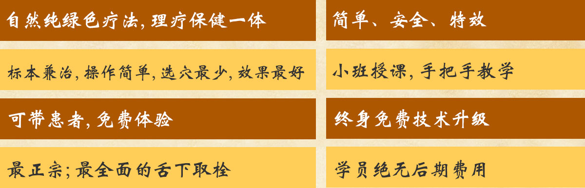 1、师资实力雄厚。主讲李老师刺血保健近20年,经验丰富,独创出具有取穴最少,效果最好,患者疼痛最少的李氏三棱针刺血技术及李氏舌下取栓等中医特色技术,对预防心脑血管疾病、三高人群、腰颈肩疾病有独特的疗效。